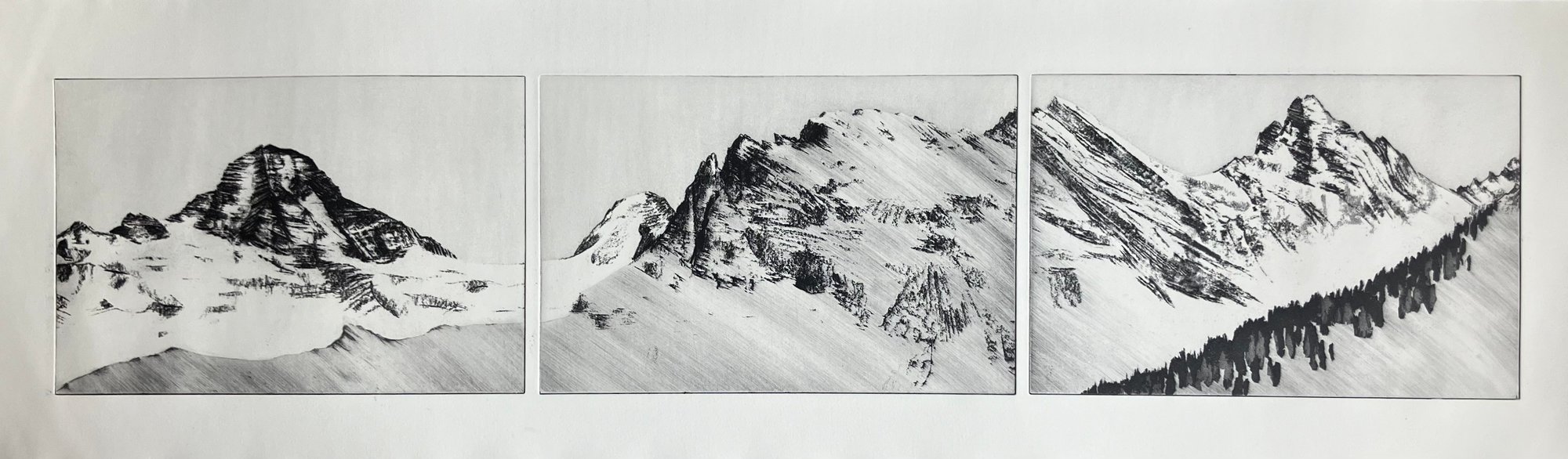 This is a triptych of 3 etchings printed together to capture the entire panaroma towards the end of the valley from the village of Murren, Switzerland.