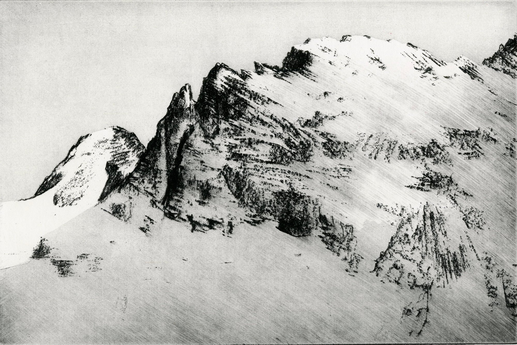 This etching is inspired by Tschingelhorn mountain shining behind a closer range of peaks, in Murren, Switzerland. Printed on Hahnemuhle paper, edition of 25. It is part 2 of a triptych of the entire panorama from the village of Murren (see Murren Panorama).
